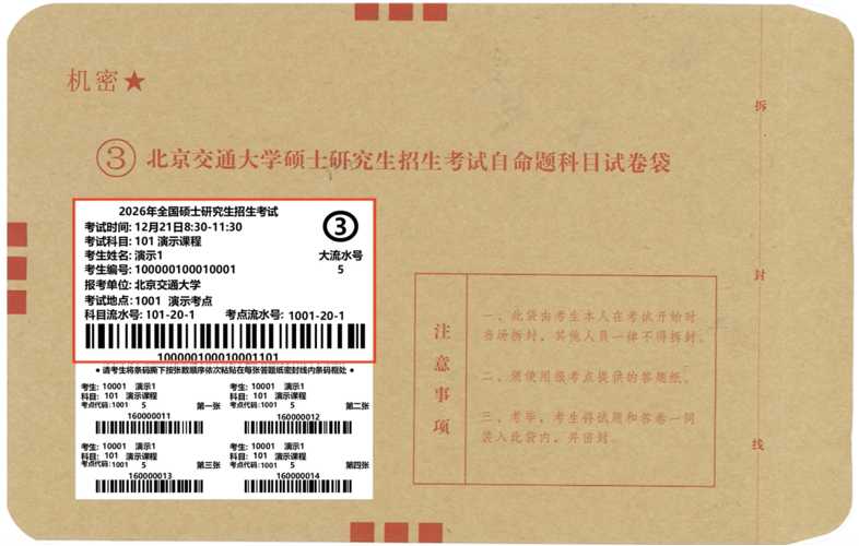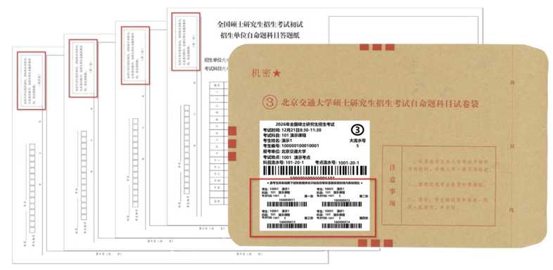 参加考试时,考场会发放自命题科目答题纸,其左上角设有条码粘贴区域,并且带有序号,同时,每位同学将会获得带有答题纸条形码的试题信封。