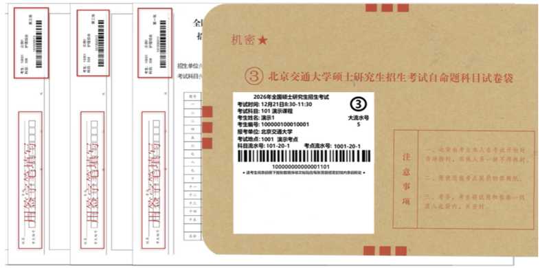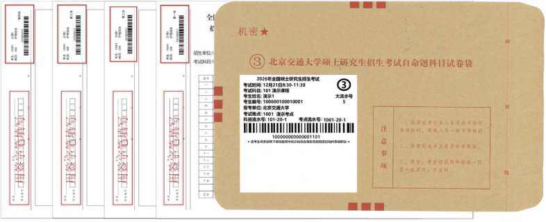 北京交通大学硕士研究生招生考试自命题将采用电子阅卷,参加考试时,每位同学(考901设计创意、910建筑快题设计、911城乡规划快题设计的科目除外)将会获得带有答题纸条形码的试题信封。请报考北京交通大学(10004)且使用自命题科目的考生认真阅读本说明。报考其它招生单位的考生请关注所报考招生单位的相关通知。