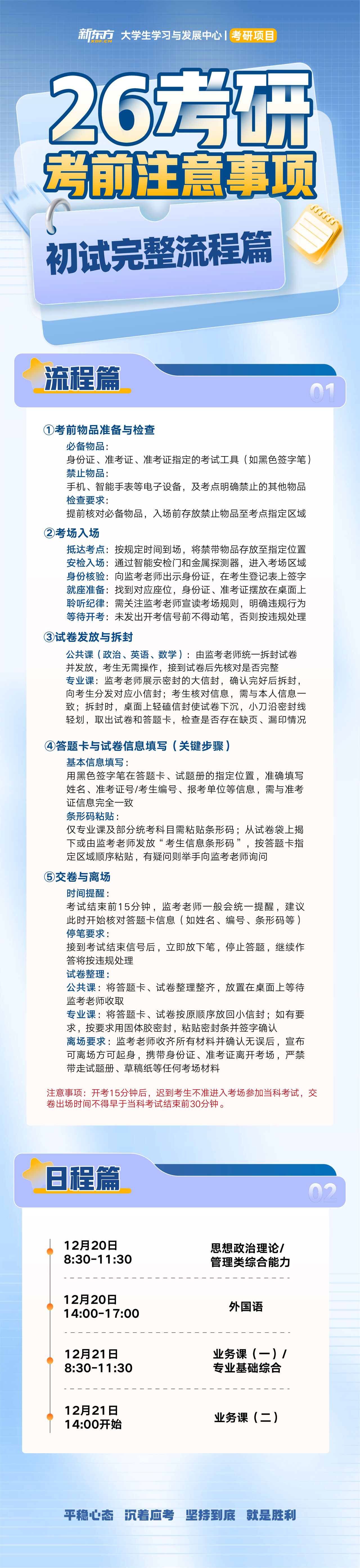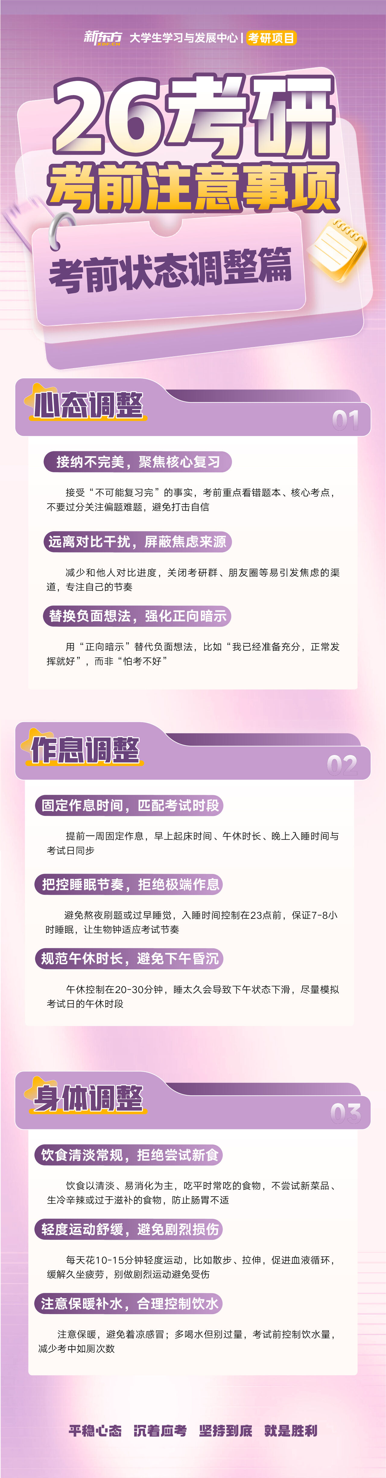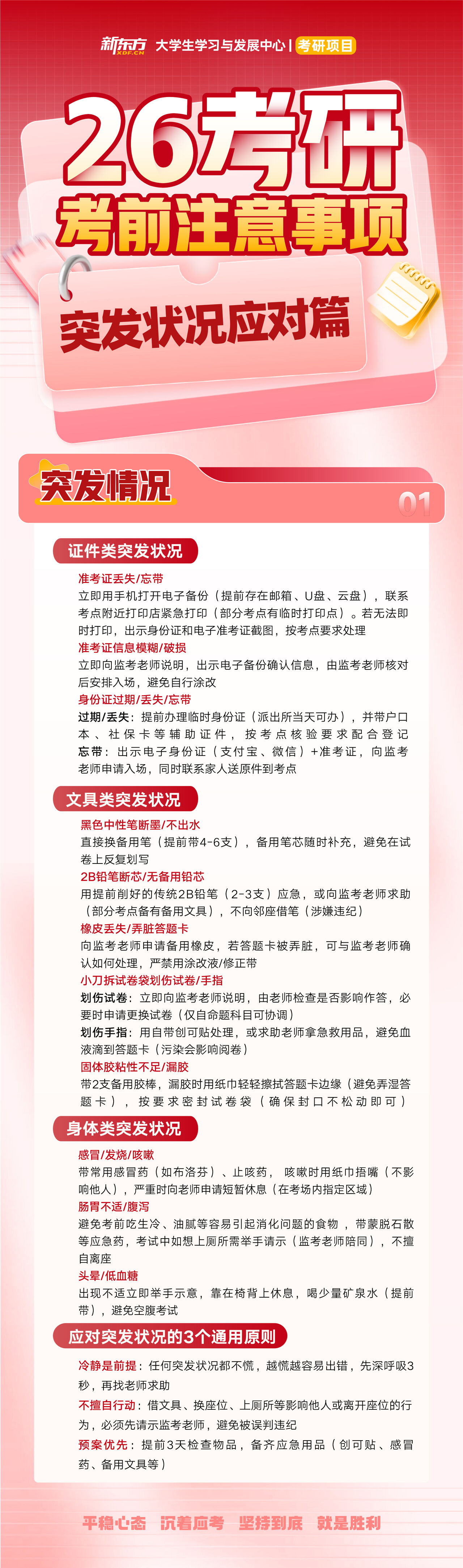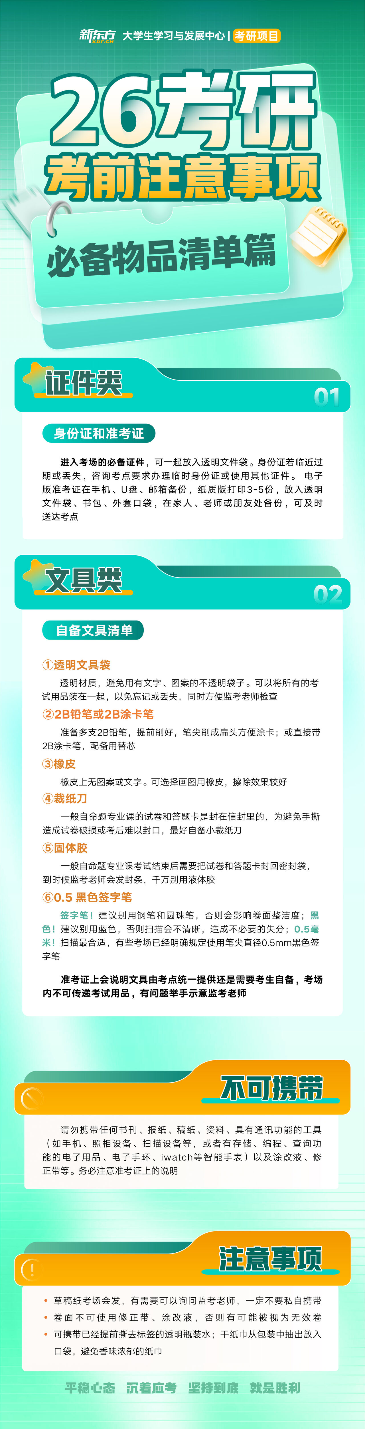 距离2026年硕士研究生招生考试只有12天了,考前的规范准备是保障顺利应考的重要前提。为帮助考生明确相关要求,本文整理了一些考前需要注意的内容,清晰明确了必备清单、准备流程、突发状况、状态调整等考场注意事项,供考生参考落实。
