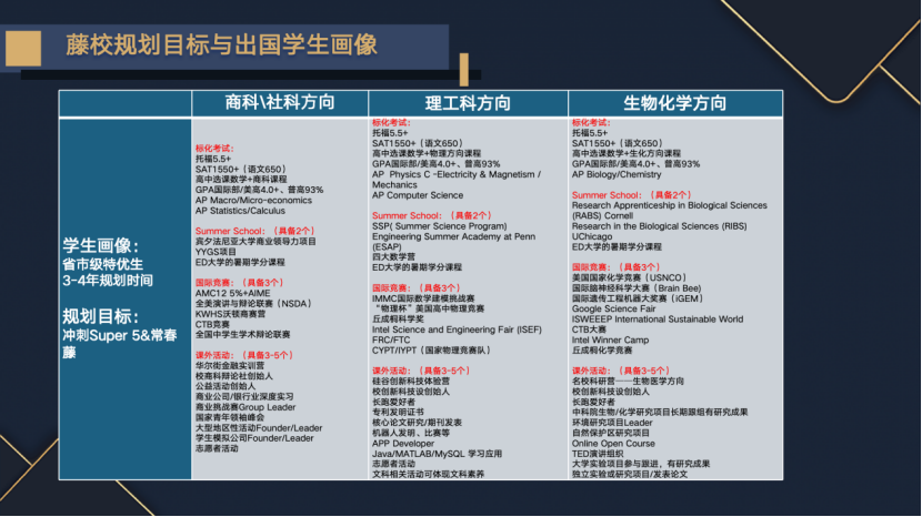 明磊老师建议,成绩优秀的学生应将目标锁定在申请美国藤校或TOP30名校;成绩一般的学生则应着眼于未来10-20年的朝阳产业,选择具有前瞻性的专业方向。