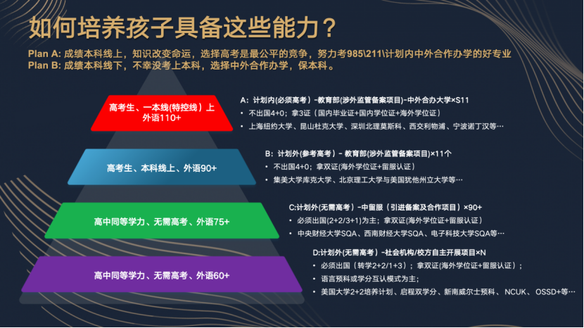 对于工薪家庭,明磊老师理解其在高昂留学费用、孩子安全等方面的顾虑,提出了以国内高考为基础,结合中外合作办学的务实路径。他建议,成绩在本科线上的学生应努力冲刺985/211院校的中外合作办学项目;若成绩未达本科线,也可通过计划外的中外合作办学项目,确保获得本科学历。