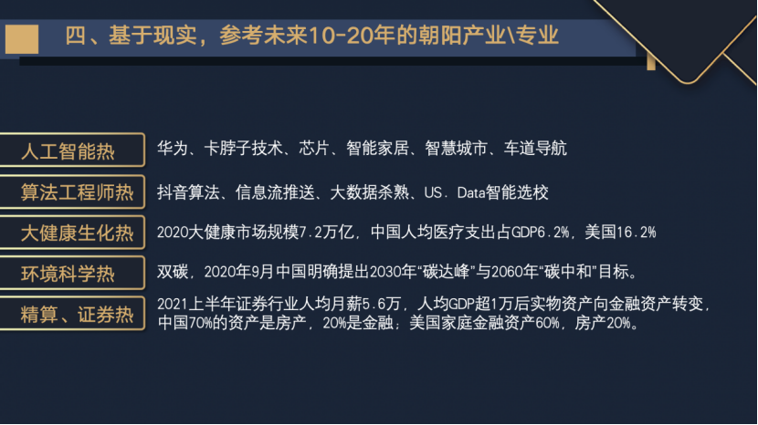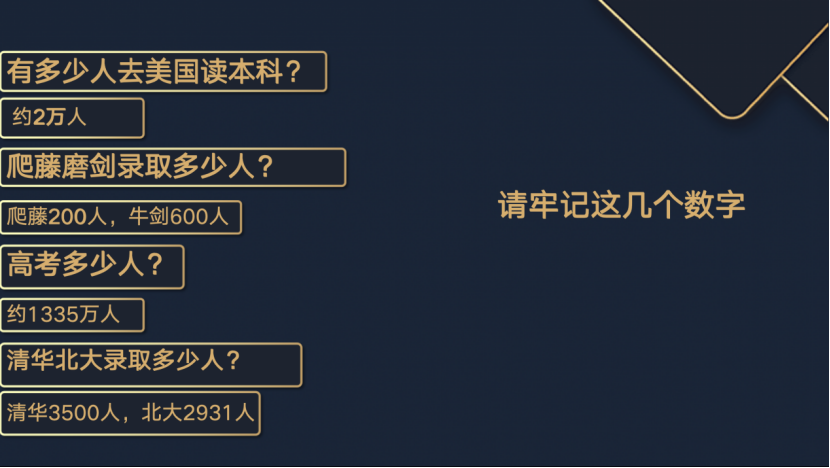 他首先给出了一组对比数据:每年约2万中国学生赴美读本科,其中约200人能进入藤校;而国内高考人数高达1335万,仅约6400人能进入清华北大,以此凸显了留学在特定维度上的竞争优势。