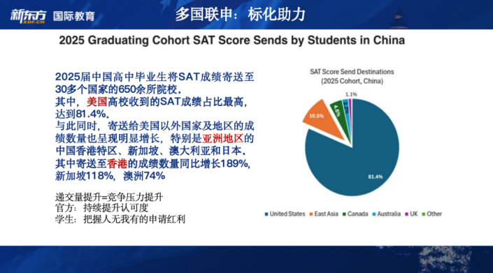 同时,随着越来越多国家和地区的高校在官网等招生平台上公布SAT成绩要求。根据官方数据显示:在过去一年,将SAT成绩递交至中国香港地区、新加坡、澳洲和日本的学生数量几乎翻倍增长,SAT成绩正在为考虑多国联申的学员带来人无我有的申请红利。