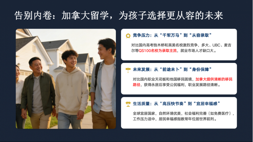 此外,明磊老师还补充了以就业或移民为导向的其他留学目的地选择,特别推荐了加拿大。他强调:加拿大不仅拥有世界一流的教育质量和高性价比的留学成本,还以其安全稳定的社会环境、多元包容的文化氛围以及友好的移民政策,为学生提供了 “不止于留学” 的理想发展平台。
