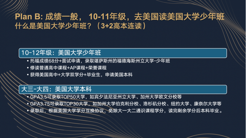2.对于成绩一般的孩子,则可考虑在10-11年级入读美国大学少年班(3+2高本连读),提前衔接高等教育。