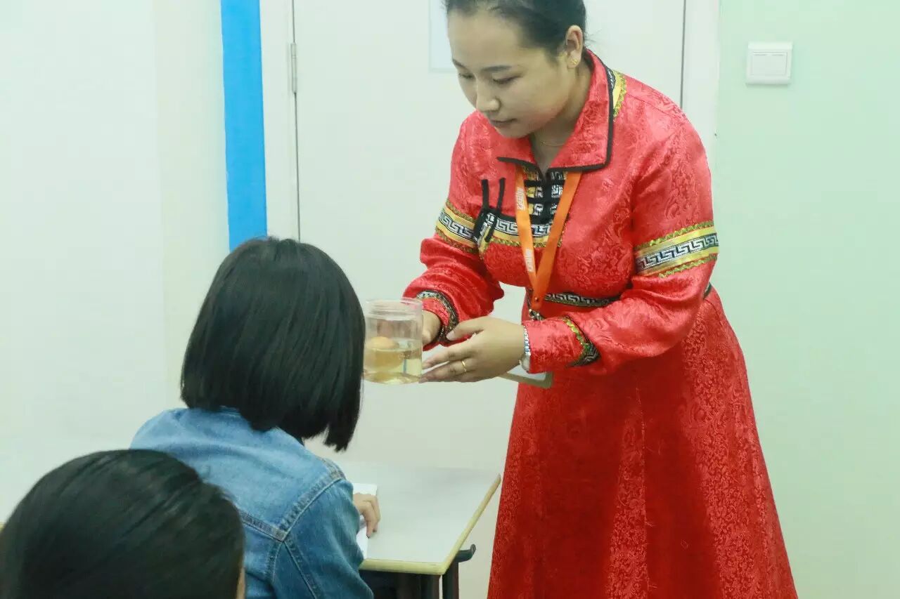 今天大家表现很好,老师奖励你们喝奶茶~先排队喷洗手液,洗完手过来喝奶茶吧~一会儿给你们介绍一些蒙古族的风俗~