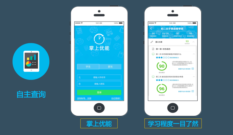 刚才我们提到过,在我们的课堂会产生很多数据,通过我们后台的统计和记录,老师和家长可以通过我们的掌上优能APP,随时随地进行查看。