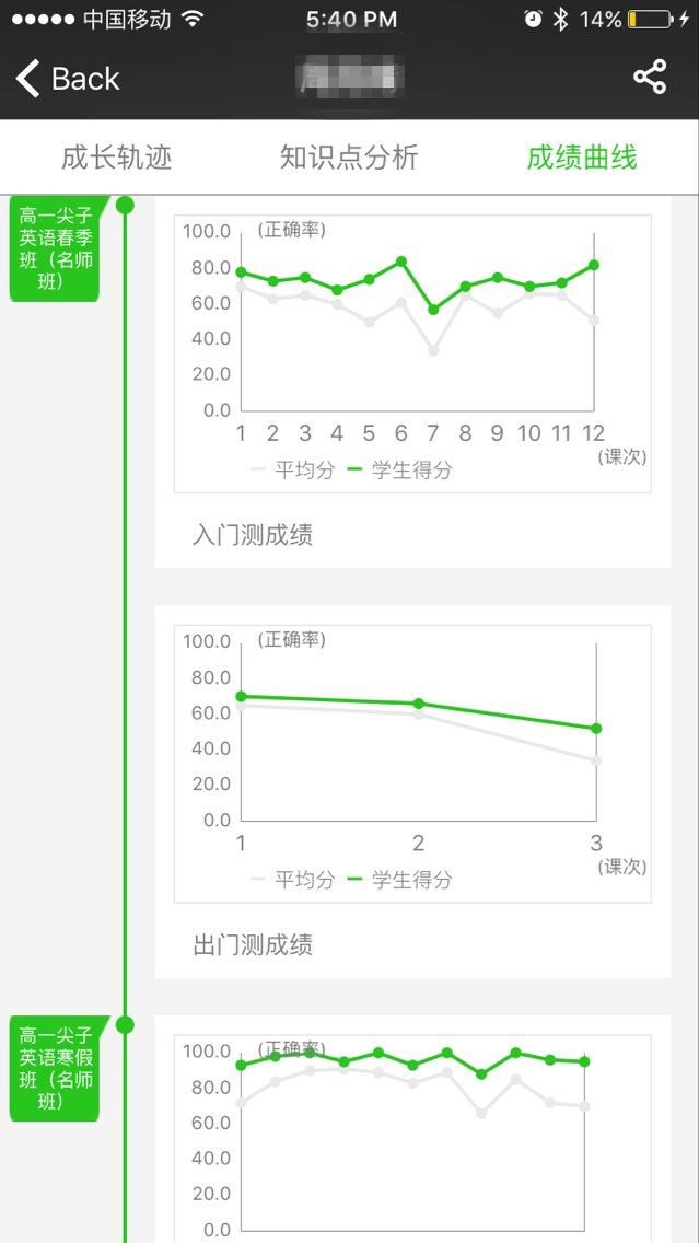 打开掌上优能,点开对应的班级,首先看到的是最近一次的课堂出门测全班成绩。点开孩子的姓名后,我们可以看到三个板块的内容:成长轨迹,知识点分析,成绩曲线。