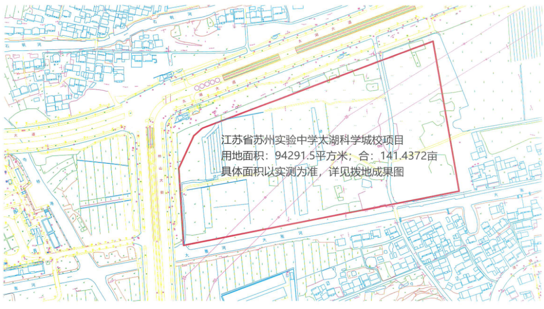 根据目前所公示的信息,学校建设地点在苏州高新区镇湖街道,太湖大道绿化地南、规划道路西。往西走约700m就是太湖。江苏省实验中学太湖科学城校区总投资约61152万元,建成后形成20轨60班的教学规模。项目总用地面积94291.5平方米,总建筑面积约108000平方米(其中地上建筑面积约96000平方米,地下建筑面积约12000平方米),绿地率约35%。苏州实验中学本部占地面积是94亩,建筑面积约3.1万方,而科技城校区占地面积是152亩,建筑面积约9万多方。实验中学太湖科学城校区建设工期约12个月,计划2023年7月开工,预计2024年6月竣工,最早2024年秋季,最迟2025年秋季应该就能招生了。