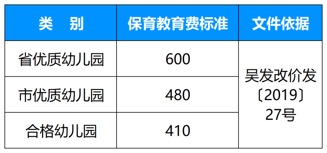 4、普惠性民办幼儿园保育教育费标准可参照《关于调整吴江区公办幼儿园保育教育费收费标准的通知》(吴发改价发〔2019〕27号)有关规定执行。