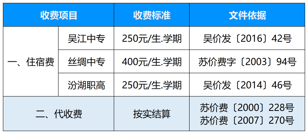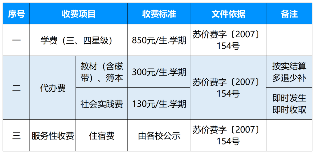 1、根据《江苏省关于扩大中等职业教育免学费政策范围进一步完善国家助学金制度的实施办法(试行)》(苏财规〔2012〕36号)等有关规定,对公办中等职业学校全日制正式学籍一、二、三年级在校学生免除学费(艺术类相关表演专业学生除外);非全日制正式学籍一、二年级在校生中涉农专业学生免除学费;对公办中专校举办的三、二分段或五年一贯制大专班后两年的收费,按第四年时公布的普通高校专科收费标准执行。