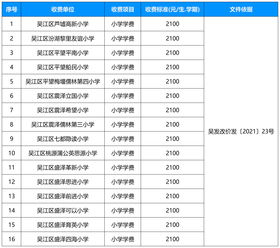 2023年江苏省苏州市吴江区秋季中小学幼儿园收费公示