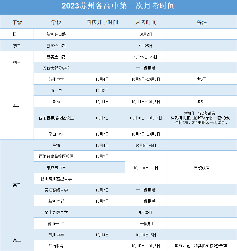 今年苏州各高中月考时间大部分安排在5号6号,月考联考较少,大多自行安排。我们可以看到,目前苏州最早开学的是市一中,10月3号就开学了,最早月考的是苏高中和星海,国庆假期内就月考。其他大部分学校是在十一假期后进行月考。