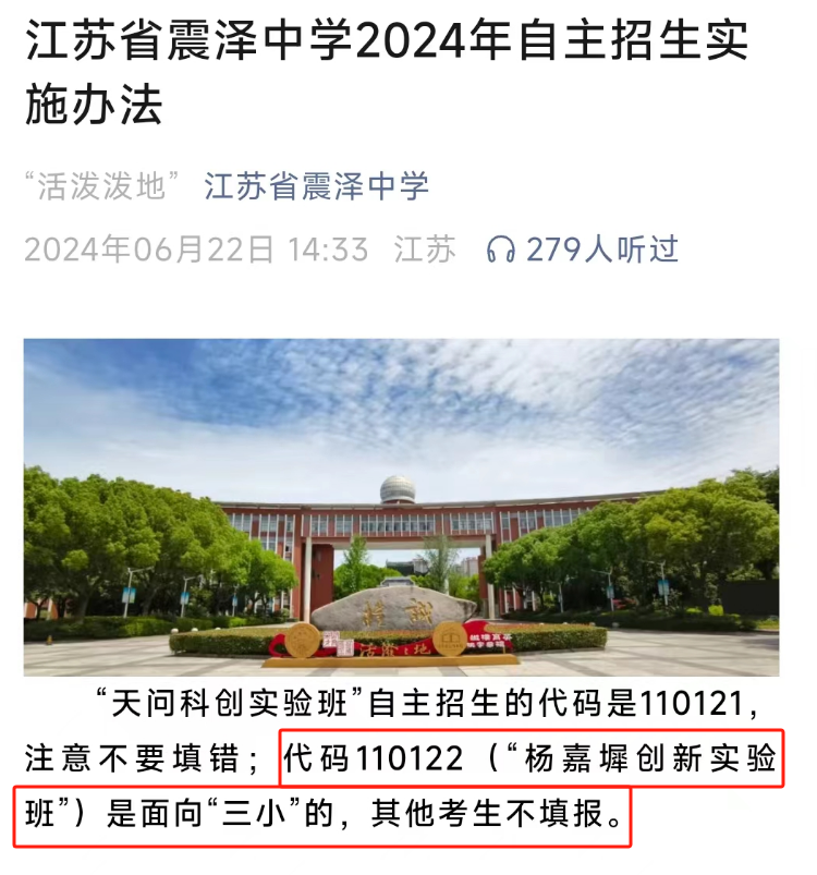 值得注意的是,震泽中学中考自主招生有2类:四星高中自招36人(天问科创项目)+特色项目自招105人(杨嘉墀创新实验班),四星高中自招面向吴江区招生,但特色项目自招仅面向”三小“的学生,对于目标震泽中学的同学来说,第一步进到吴江三小,中考时就多一个机会!