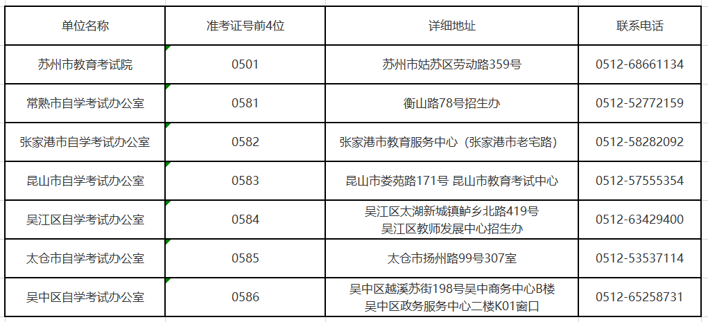 地点:苏州市教育考试院(劳动路359号)一楼服务大厅(限准考证号为0501开头的考生)。其他市(区)考生依照准考证属地,到相应考办咨询、办理,具体见下表: