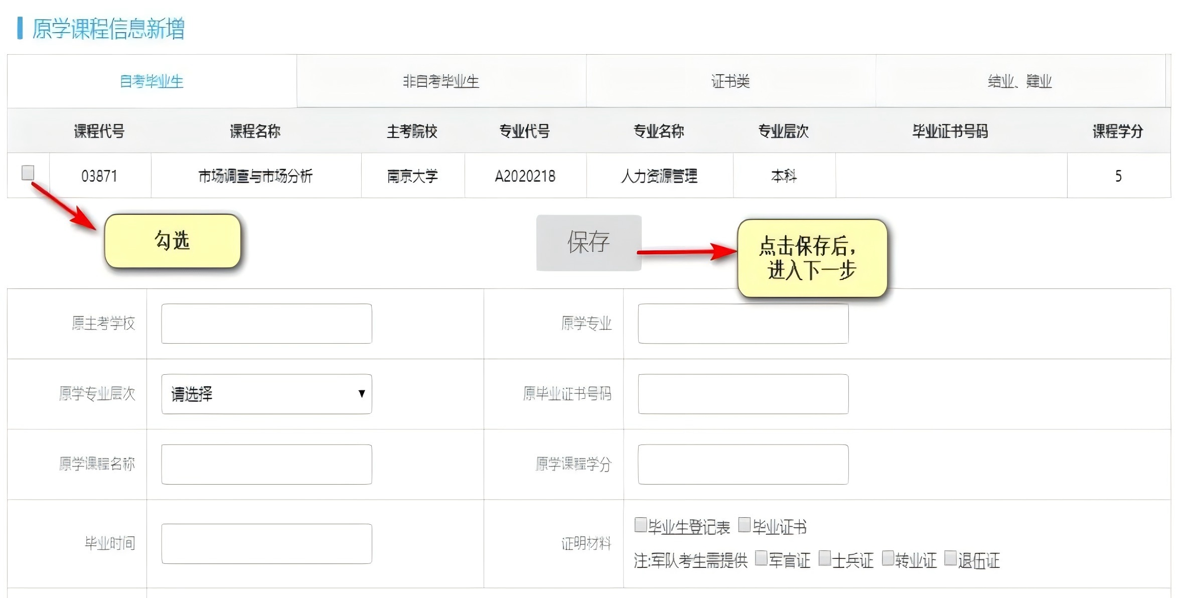 (二)考生如使用毕业(肄业或结业)证及毕业(肄业或结业)成绩单申请课程免考的,须先通过毕业证书学历审核。未通过毕业证书学历审核的,须在现场确认时提供相应证明材料(如曾用名或曾用身份证证明等)。