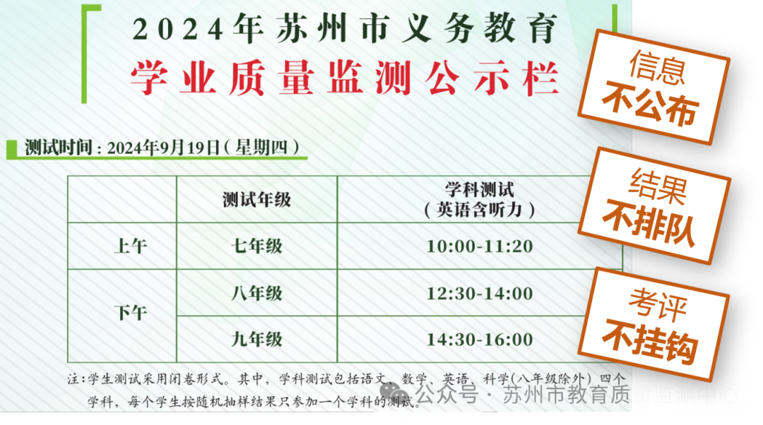 监测不对学生个体进行评价,监测结果不排队、不排名,也不与区域、学校、教师的考评挂钩!学生无负担,老师没压力!