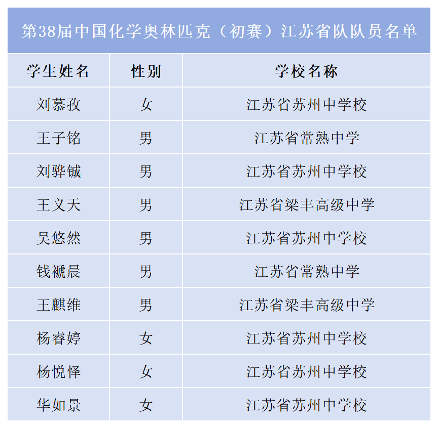 近日,2024年第38届中国化学奥林匹克(初赛),31省市一等奖获奖名单公示,江苏共有134名学生榜上有名,在江苏省一等奖获奖名单中,苏州共49人上榜,位列全省第一。