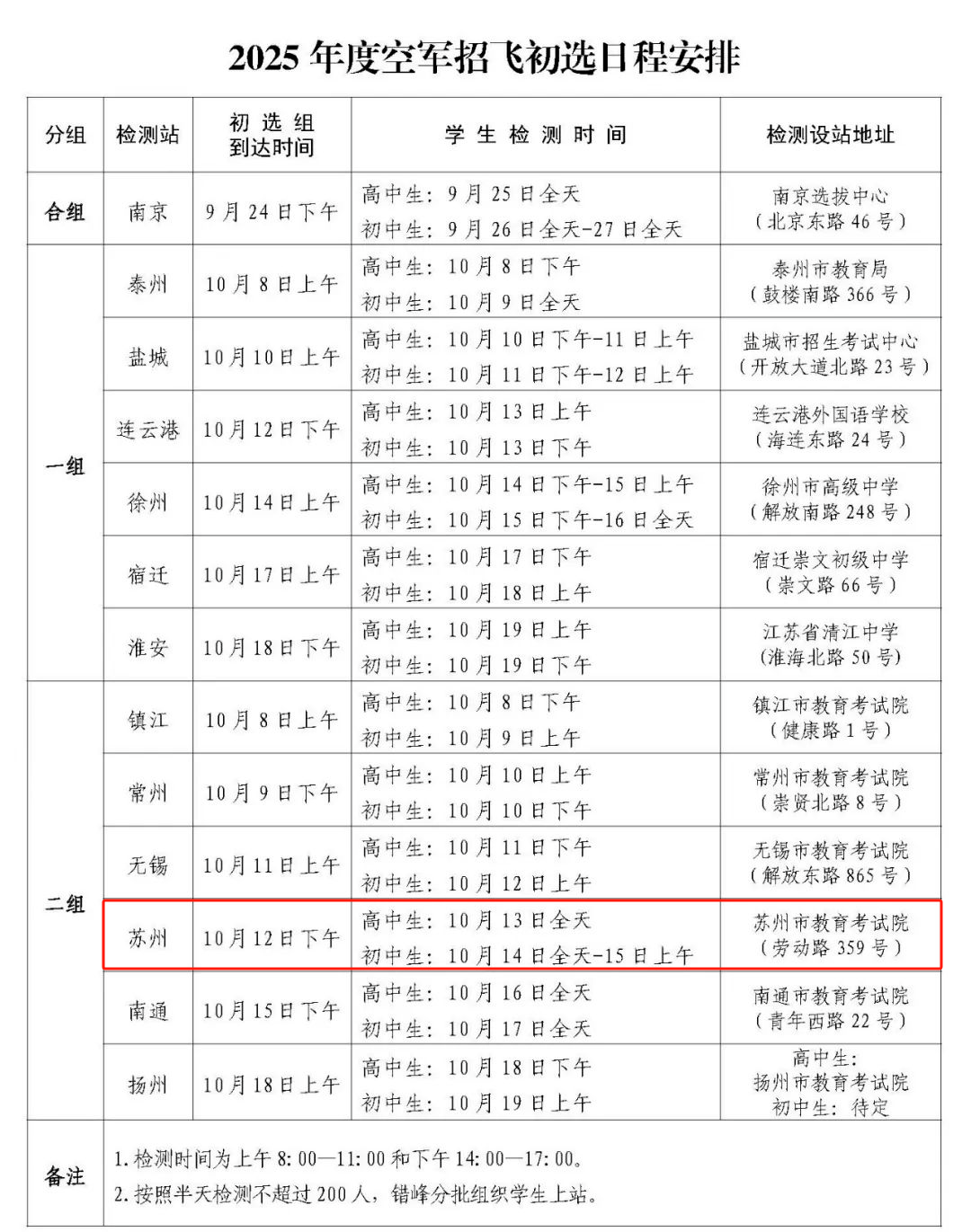 根据2025年度空军招飞工作安排,9月25日至10月19日,空军招飞局南京选拔中心将派初选组赴各地市,对报考空军飞行学员和江苏省空军青少年航空学校的学生进行检测。