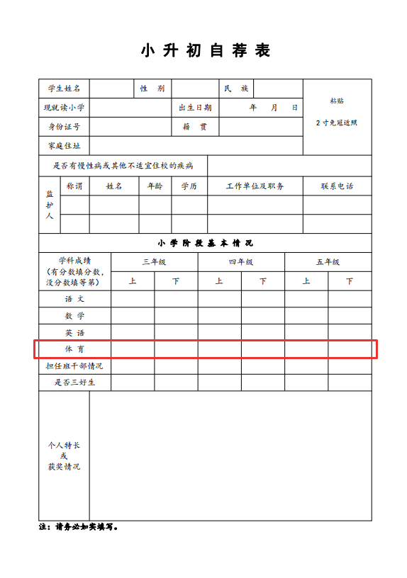 比如南师大2024级的小升初自荐表就要求填写体育的情况: