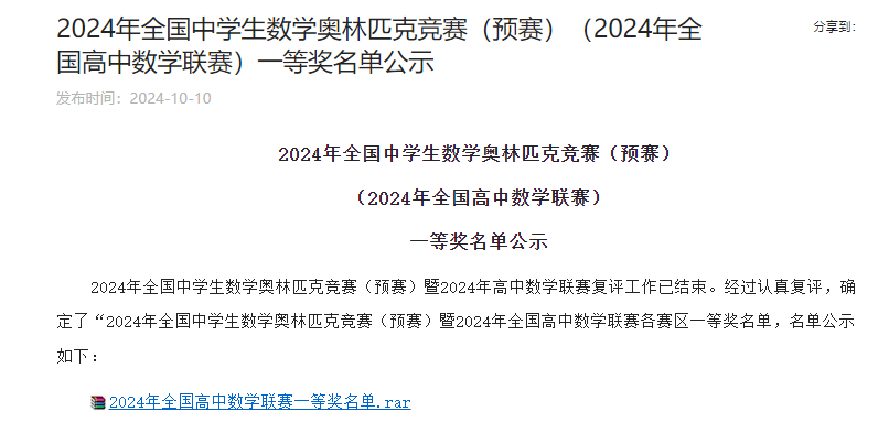 2024年全国中学生数学竞赛一等奖名单和入围省队名单出炉!