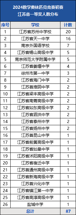 今年江苏共87人获得省一,苏中、天一、南外依旧位列前三。以下是各校省一人数统计。