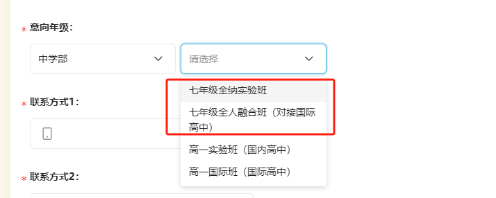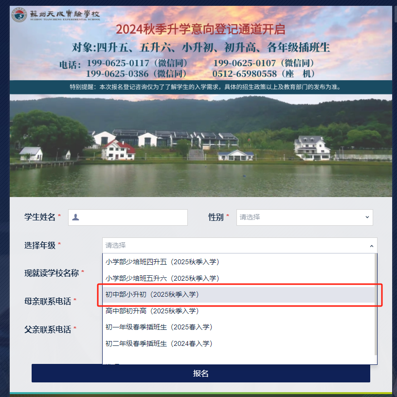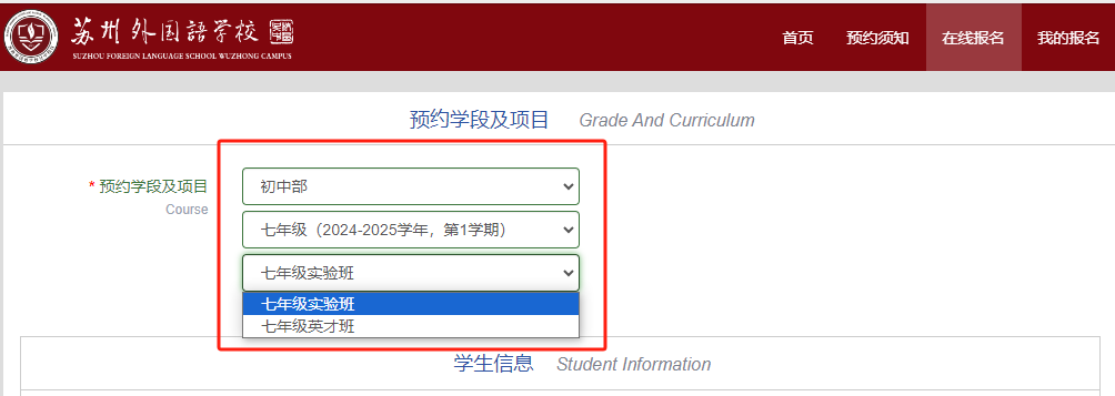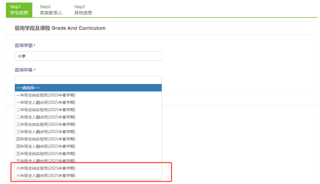 2025小升初按照图示选择学部及年级,有实验班和英才班两种班型选择