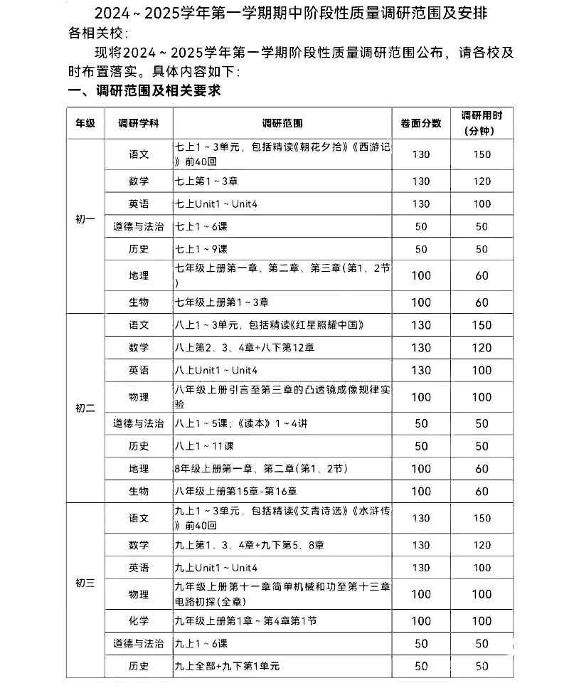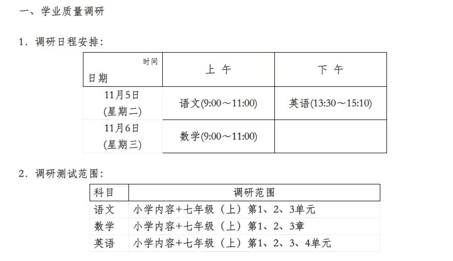 苏州六区初一年级期中考试语数外安排统考,时间在11月5-11月6日,具体考试范围见下图
