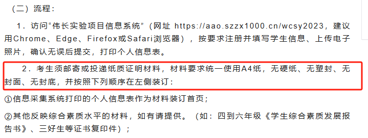 上图为伟长纸质简历的要求”......材料要求统一使用A4纸,无硬纸、无塑封、无封面、无封底......“,下方为简历必要信息展示。