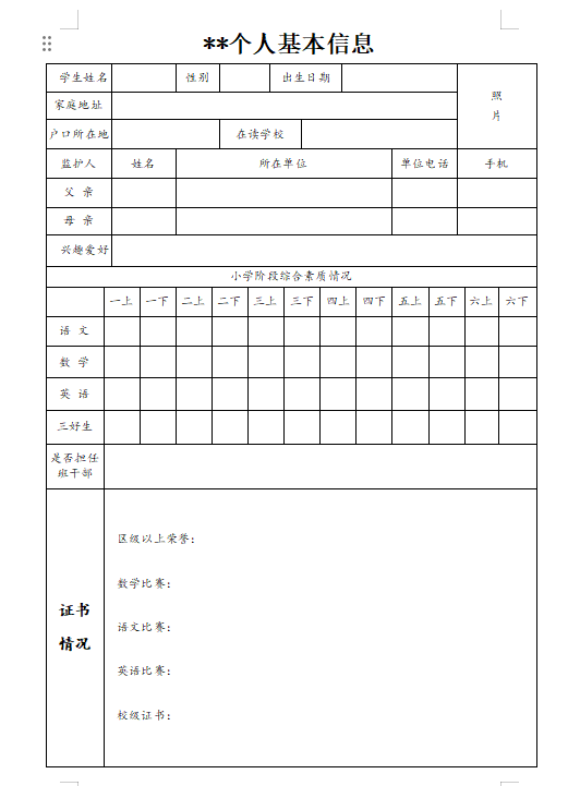 表中需要包含:家庭&学生基本信息、小学阶段成绩、所获证书梳理。