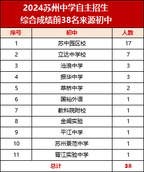 苏州中学四星高中自主招生仅面向姑苏区,招生人数一共是38人,根据学校公布的自招综合成绩截取前38名同学,得出初中来源如下: