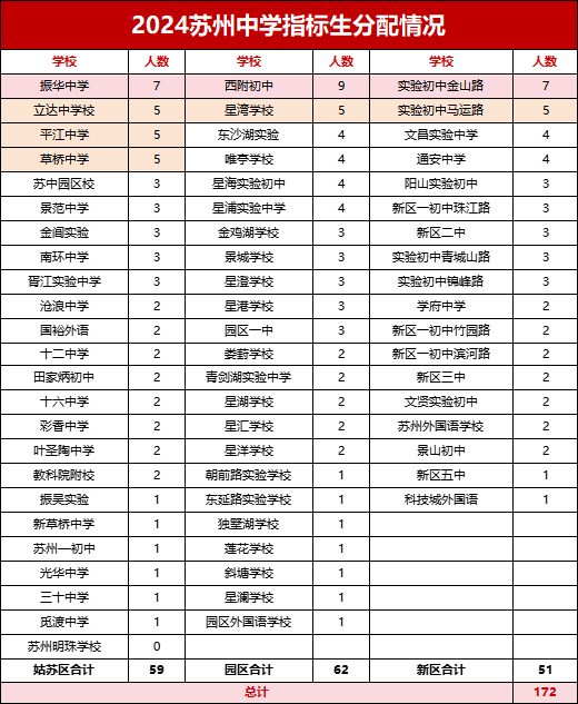 2024年苏州中学指标生招生计划共计172个名额,其中姑苏区59个名额,园区62个,新区51个: