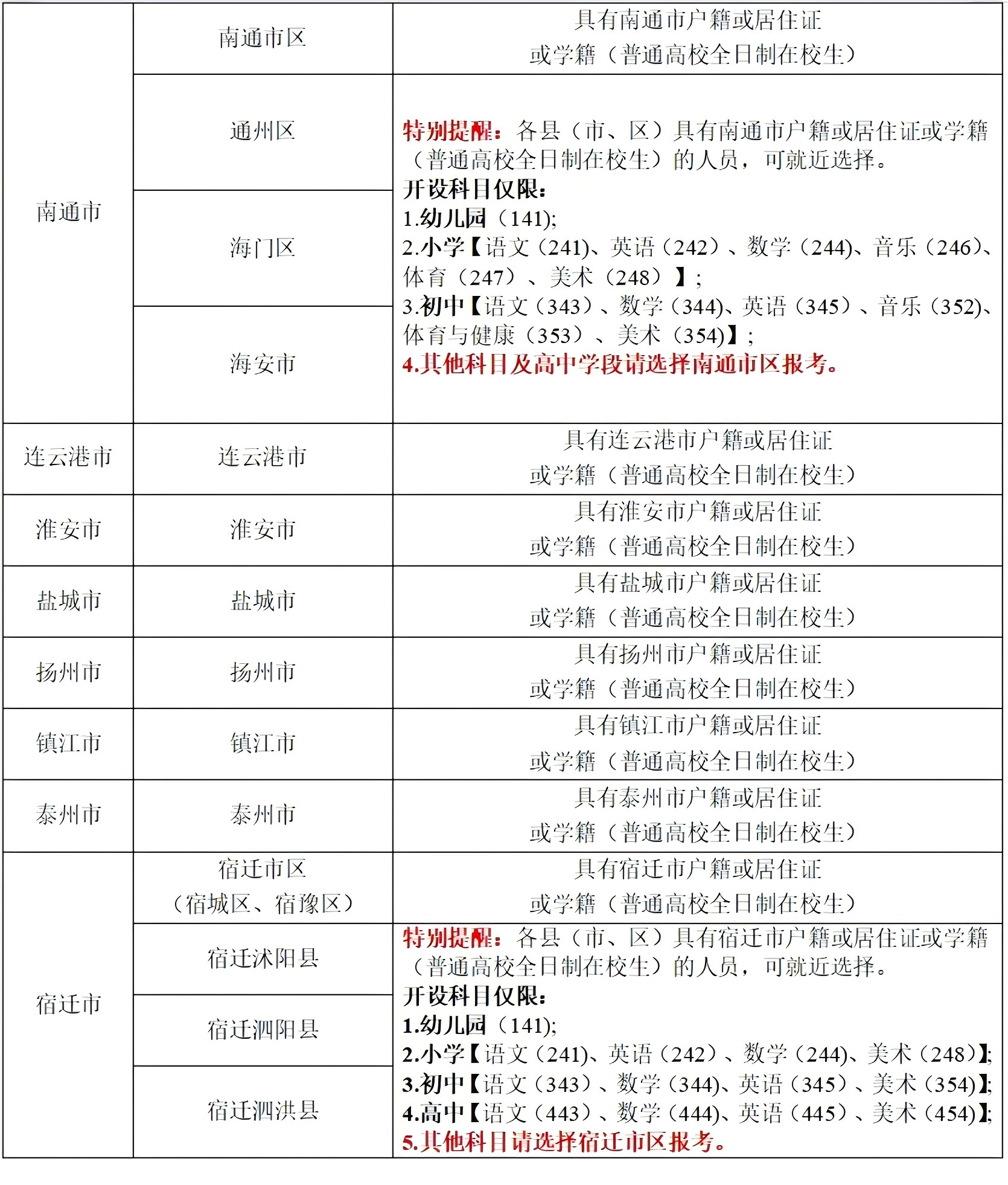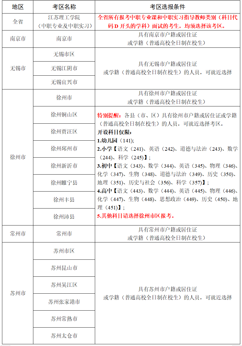 江苏省2024年下半年中小学教师资格考试面试考区及选报条件汇总表