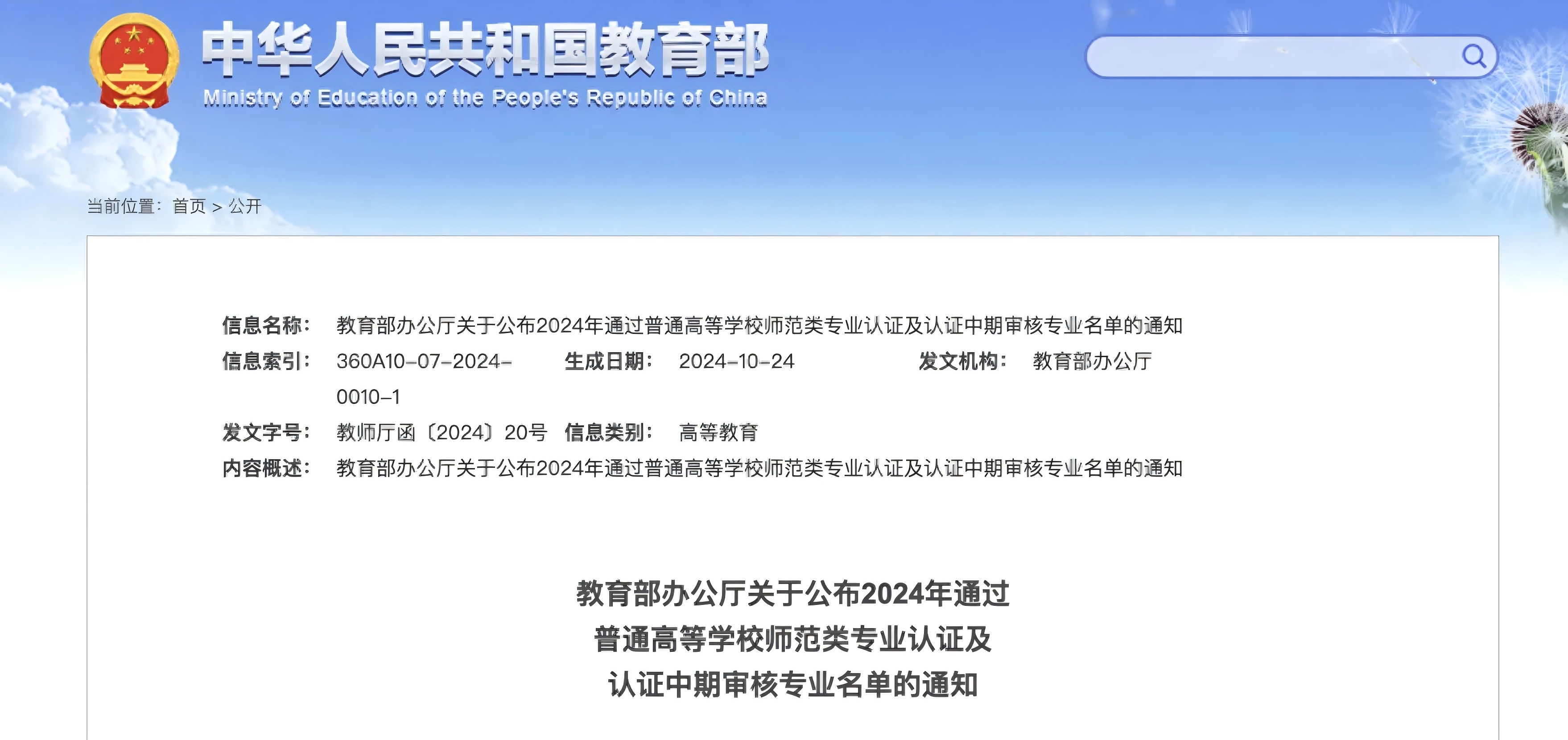 通知内容显示,根据《中共中央国务院关于弘扬教育家精神加强新时代高素质专业化教师队伍建设的意见》精神,按照《教育部关于印发〈普通高等学校师范类专业认证实施办法(暂行)的通知》(教师〔2017〕13号)要求,经高校申请、教育评估机构组织专家考查、普通高等学校师范类专业认证专家委员会审定,北京师范大学英语专业等12个专业通过第三级专业认证,北京体育大学体育教育专业等613个专业通过第二级专业认证,认证结论有效期六年,自2024年10月起至2030年9月止。经高校提交整改材料、专家审查、普通高等学校师范类专业认证专家委员会审定,北京师范大学地理科学专业等263个专业通过了师范类专业认证中期审核,继续保持原认证有效期。