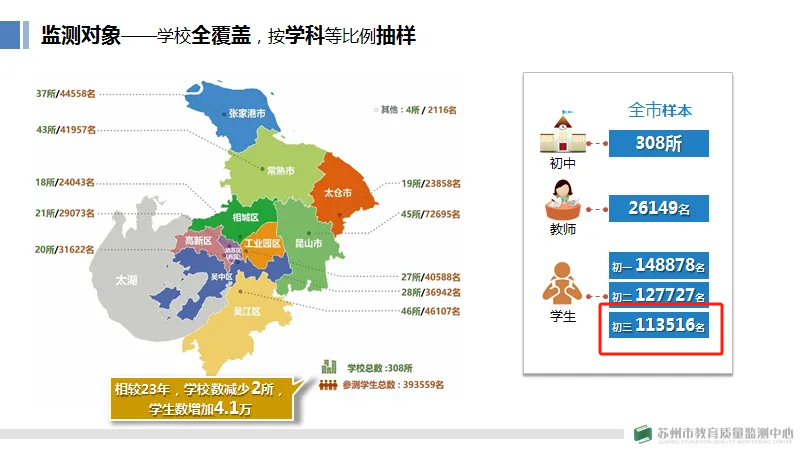 根据《2024年苏州市义务教育学业质量监测报告》数据显示,苏州全市目前共有113516名初三学生,虽然到中考还会有一定的流失比例,但是已经可以预见2025年中考人数很可能突破11万!