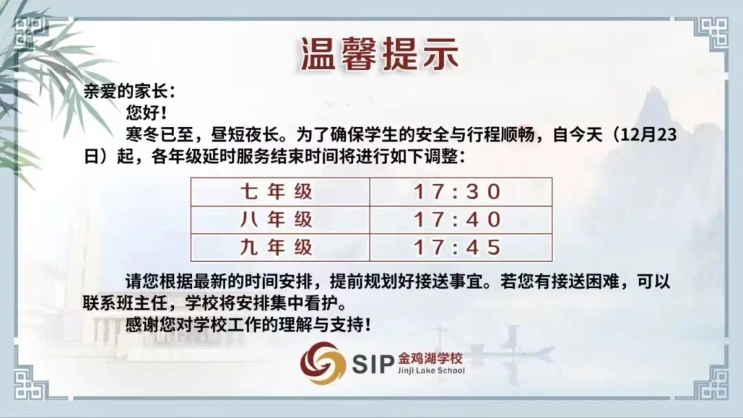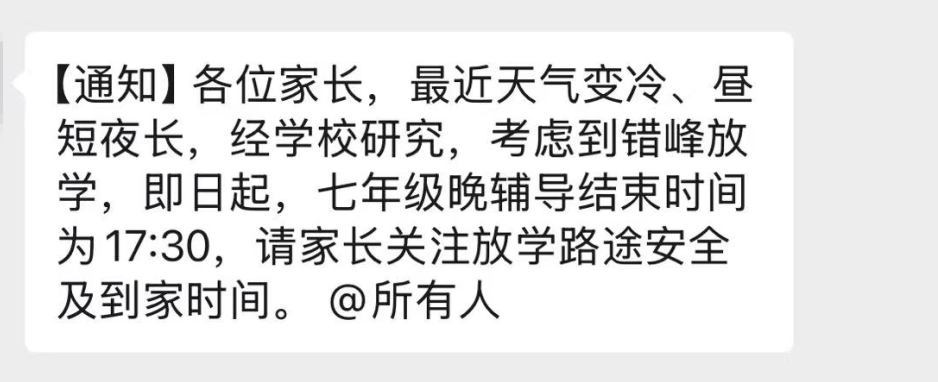 据家长反馈,景城初一年级提前到17:30放学,提前了10分钟;初三年级提前到17:45放学,提前了半小时!