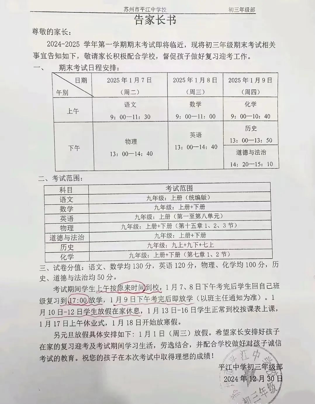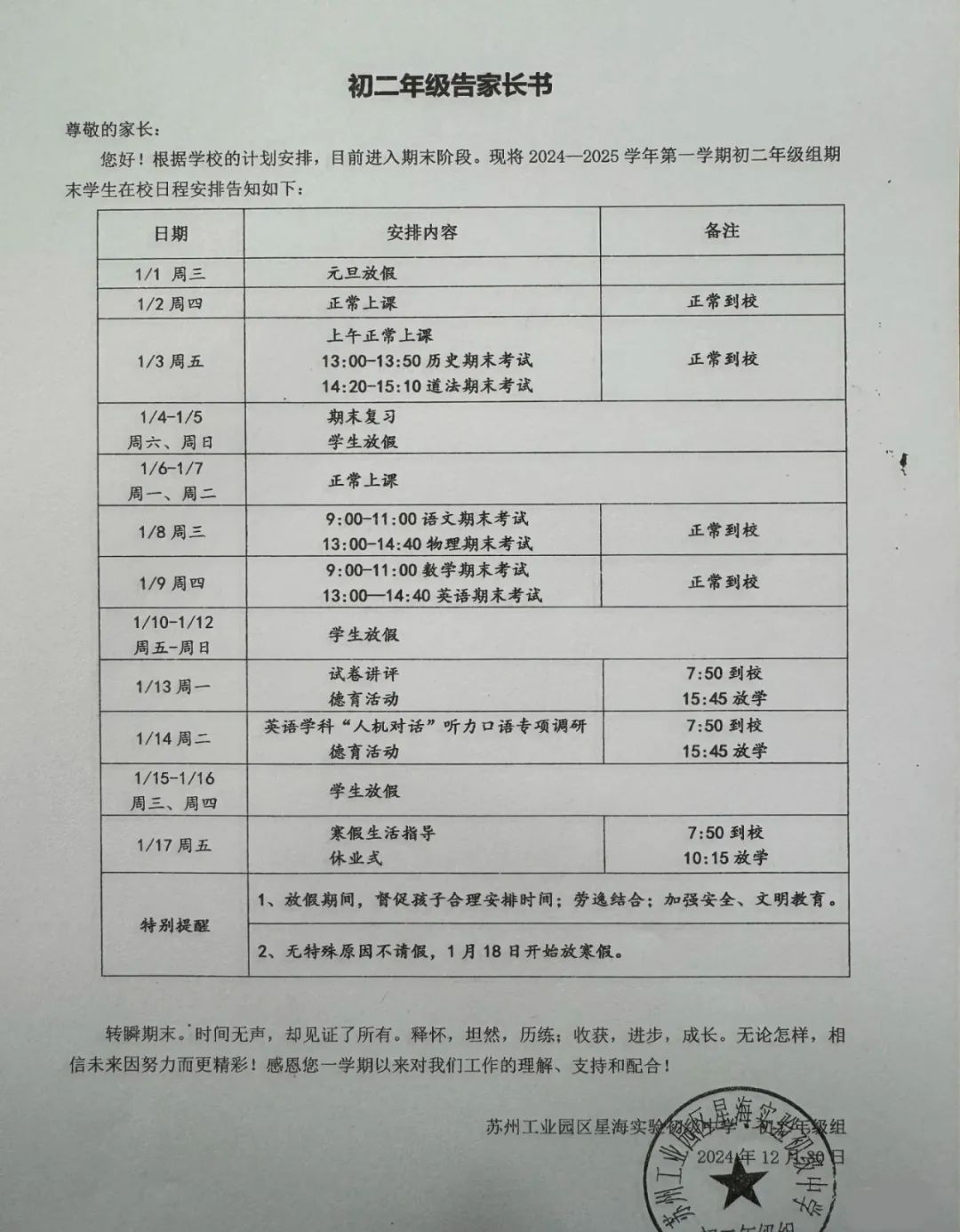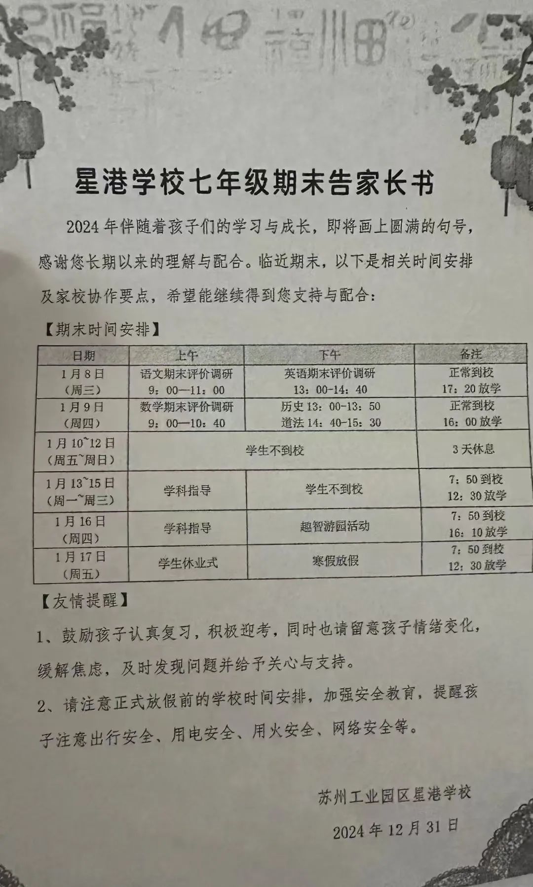 期末考试后还需返校上课?2025江苏苏州多校已发期末告家长通知书!