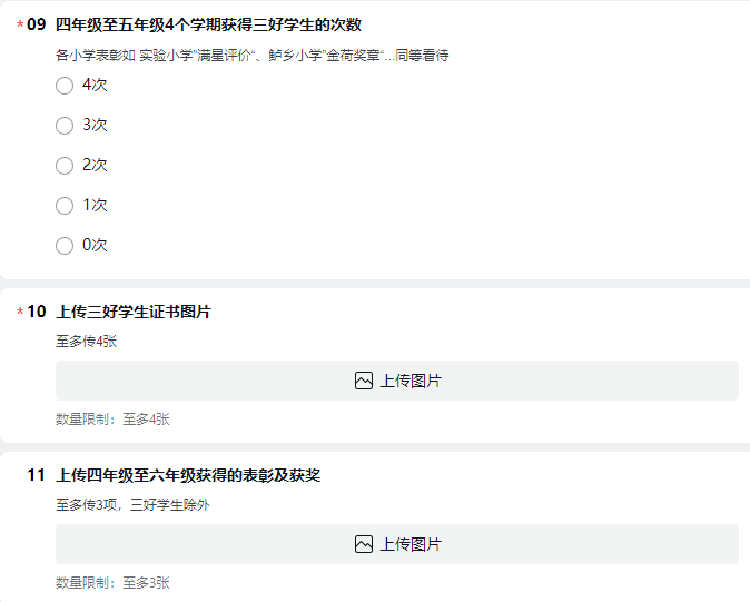 ①四至五年级4个学期获得三好(或其他同等荣誉称号)的次数