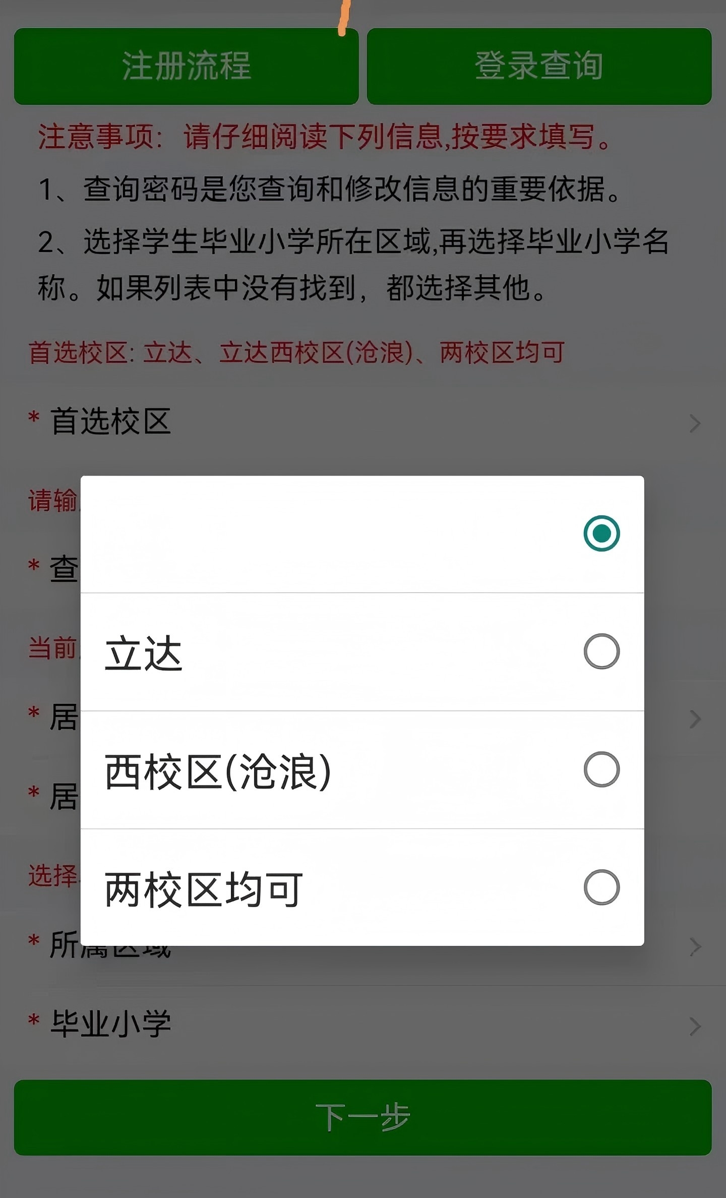先注册,首选校区可选立达、沧浪、两校均可,注册完成后依次填写学业水平、荣誉奖项、个人特长等相应信息。