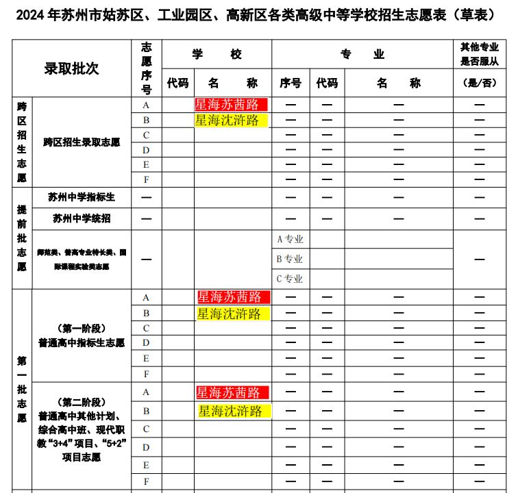 跨区AB志愿、指标生AB志愿、统招AB志愿都要填报星海苏茜路校区和沈浒路校区。