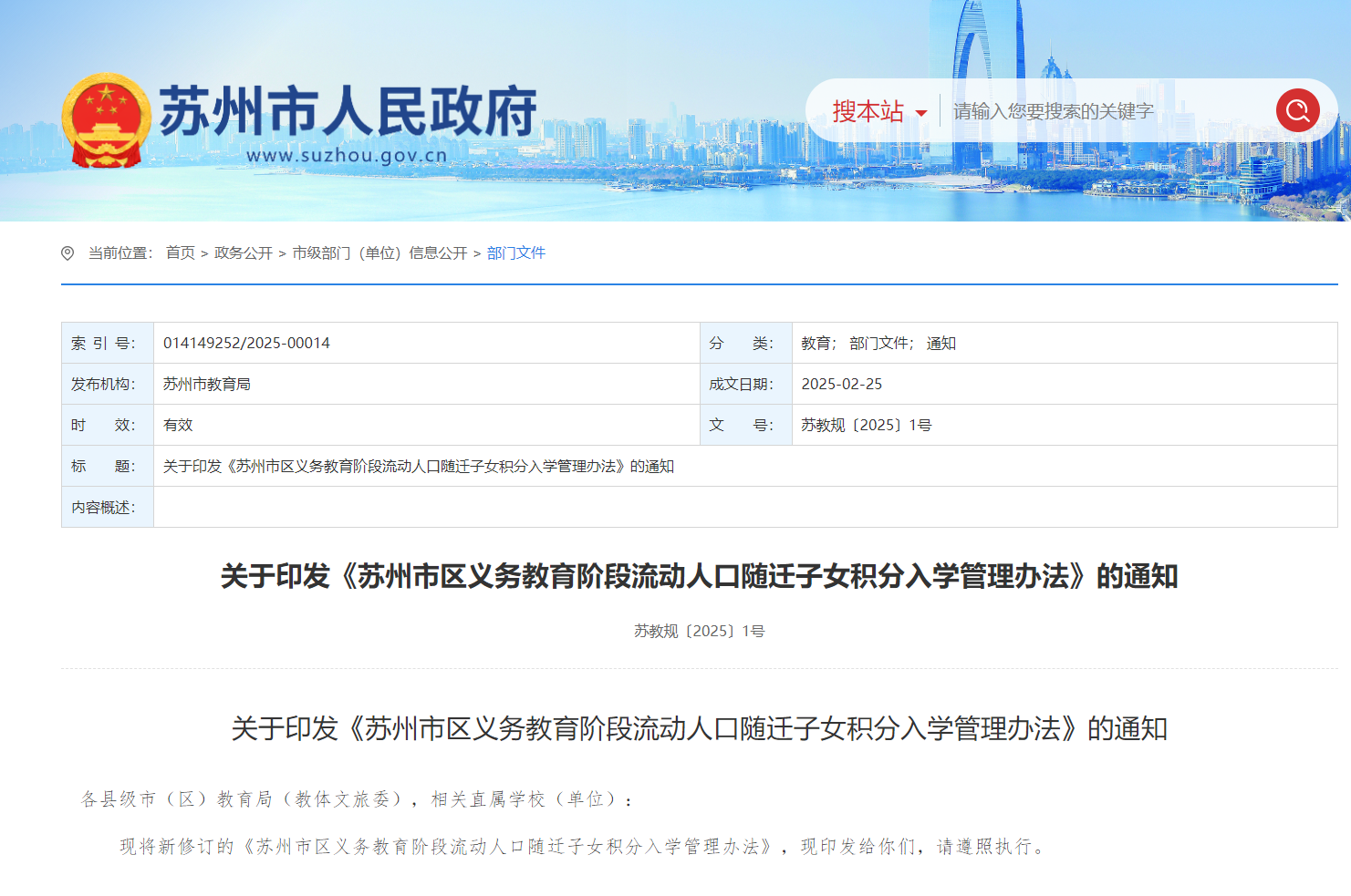 2025江苏省苏州市教育局最新通知!积分入学申请条件有调整!