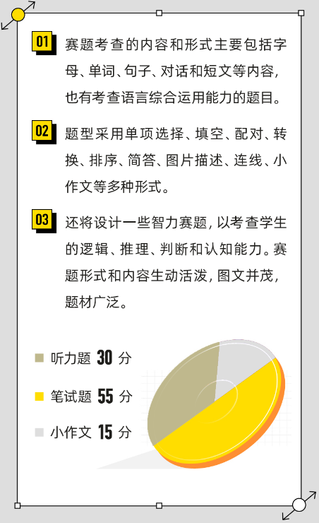 作为英语的综合型赛事,小语赛的题型包括听力、笔试、小作文等。