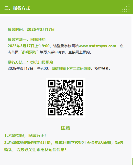 南京师范大学苏州实验学校幼儿园2025年秋季新生校园开放日游戏体验报名通道即将开通,意向家长3月17日上午9点登录南京师范大学苏州实验学校官网或扫描官方二维码进行报名。