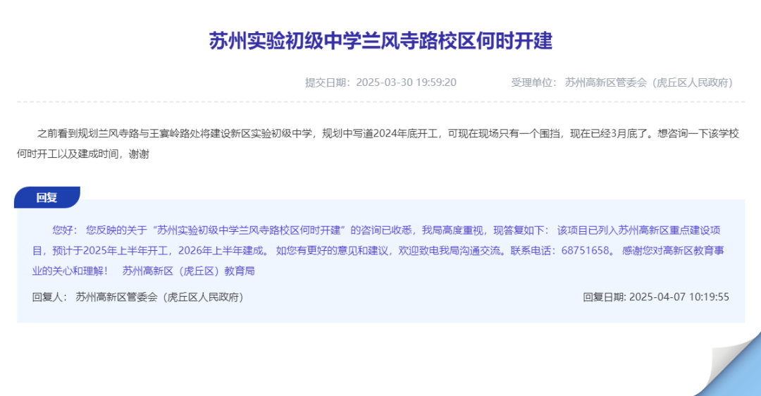 近日,有网友在苏州高新区管委会(虎丘区人民政府)网站咨询:兰风寺路与王宴岭路处将建设新区实验初级中学,规划中写道2024年底开工,可现在现场只有一个围挡,现在已经3月底了。想咨询一下该学校何时开工以及建成时间。
