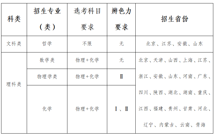 围绕党和国家在新时代赋予“双一流”高校的使命,坚持立德树人,面向国家重大战略需求,聚焦关键领域以及国家人才紧缺领域,大力推进教育教学改革和条件资源建设,努力造就具有家国情怀和国际视野、担当引领未来和造福人类的领军人才。各招生专业(类)均设立单独的培养方案,具体以各学院公布为准。其中哲学专业依托人文学院培养,数学类专业依托数学学院和人工智能学院进行培养,包含两套培养方案,物理学类专业依托物理学院和集成电路学院进行培养,包含两套培养方案,化学专业依托化学化工学院培养。