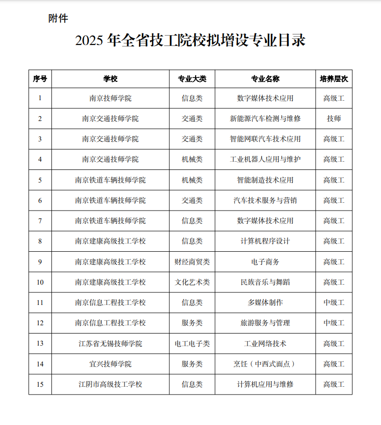 根据《江苏省技工院校教学管理规范》(苏人社规〔2010〕5号)要求,经专家审核、综合评议,拟同意南京技师学院等65所技工院校增设“数字媒体技术应用”等138个专业(详见附件)。现予公示,公示时间为2025年5月13日至2025年5月19日。如有异议,请在公示期内以书面形式向我厅反映,联系电话:025-83338110。