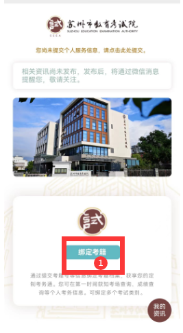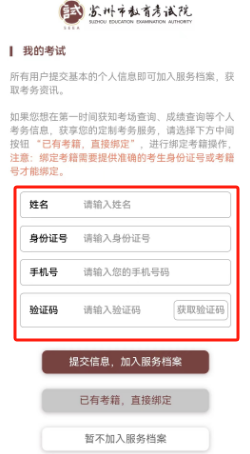 3.关注苏州教育考试公众号,下拉菜单第二个选项【我的考试】绑定一下信息,即可获取准考证号。