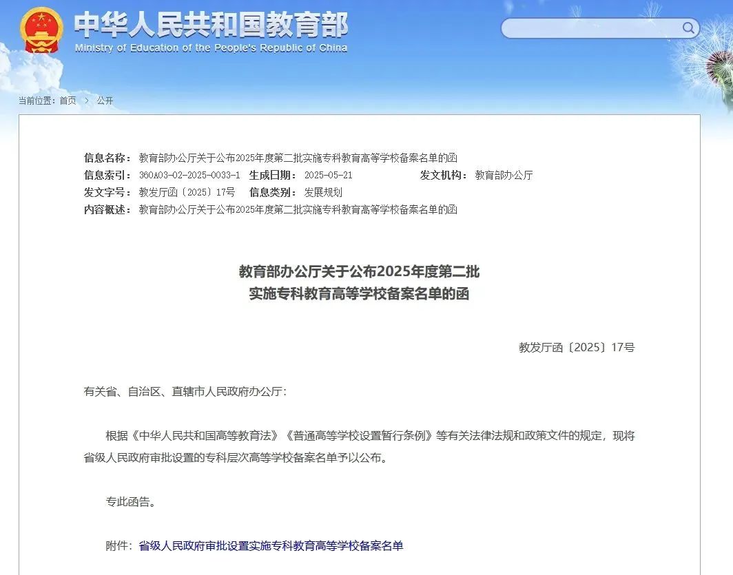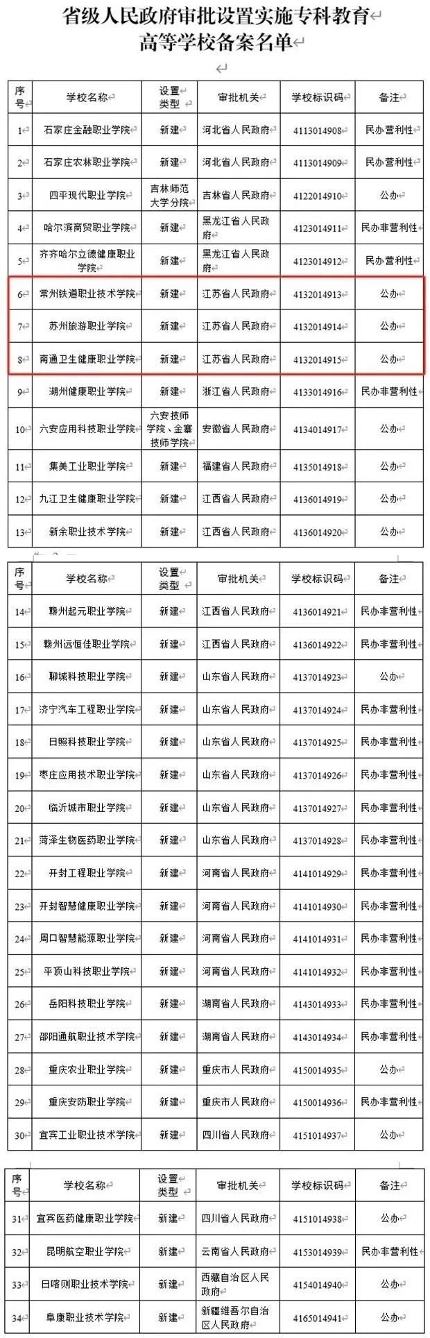 5月28日,教育部印发《关于公布2025年度第二批实施专科教育高等学校备案名单的函》,本次公布了34所新设专科院校,其中,江苏新增3所公办院校,分别是常州铁道职业技术学院、苏州旅游职业学院、南通卫生健康职业学院。