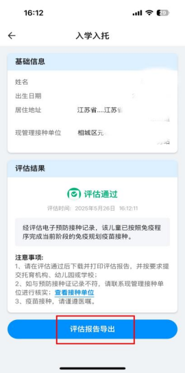 下载“江苏预防接种”APP(更新至最新版本)。完成登录后,绑定小朋友的接种档案。进入“入学入托”模块,点击评估报告导出PDF格式后打印。
