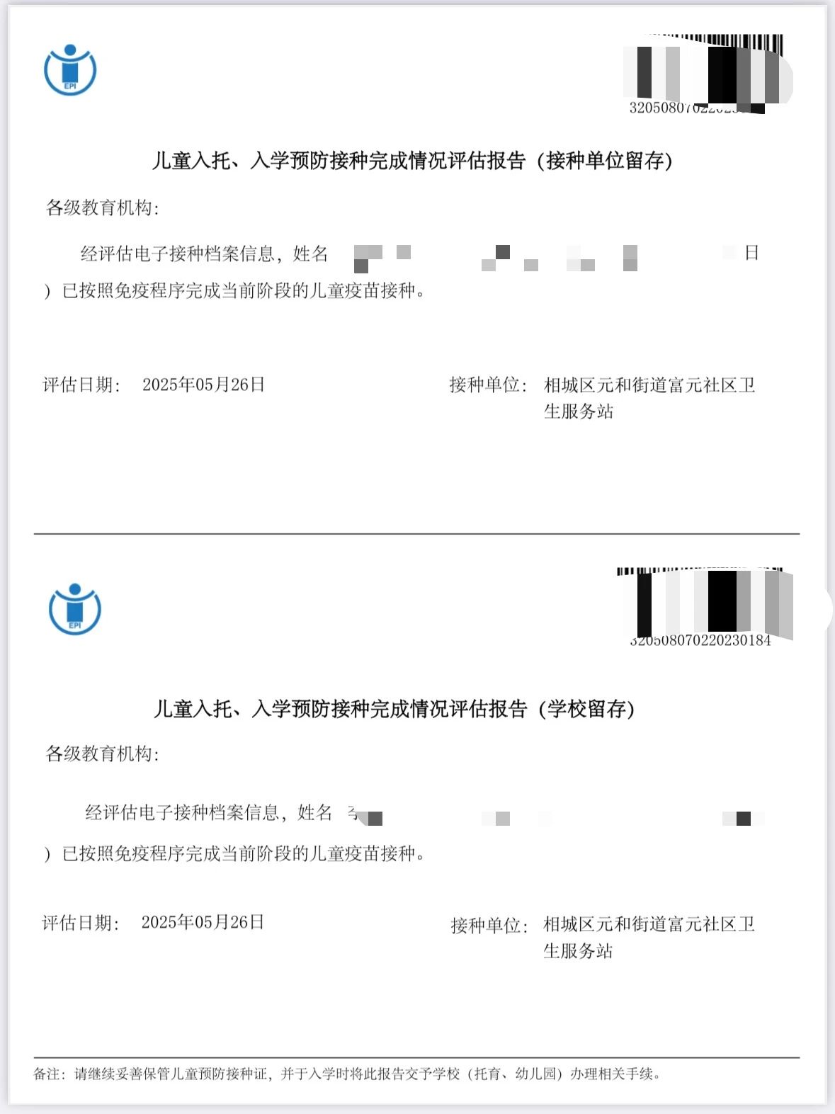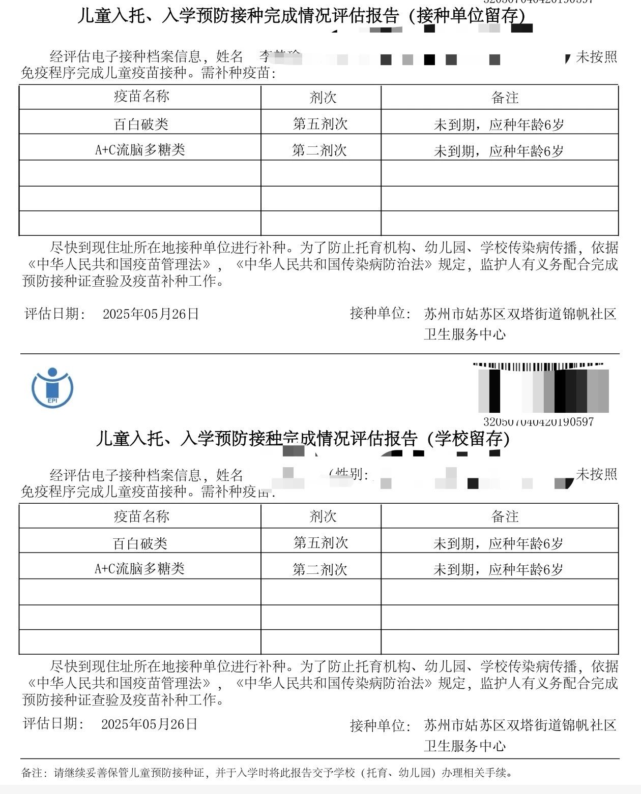 3.如果评估报告上显示您的孩子尚未完成相关疫苗接种,可根据评估报告上的提示,及时携带预防接种证到居住地的儿童预防接种单位进行补种。